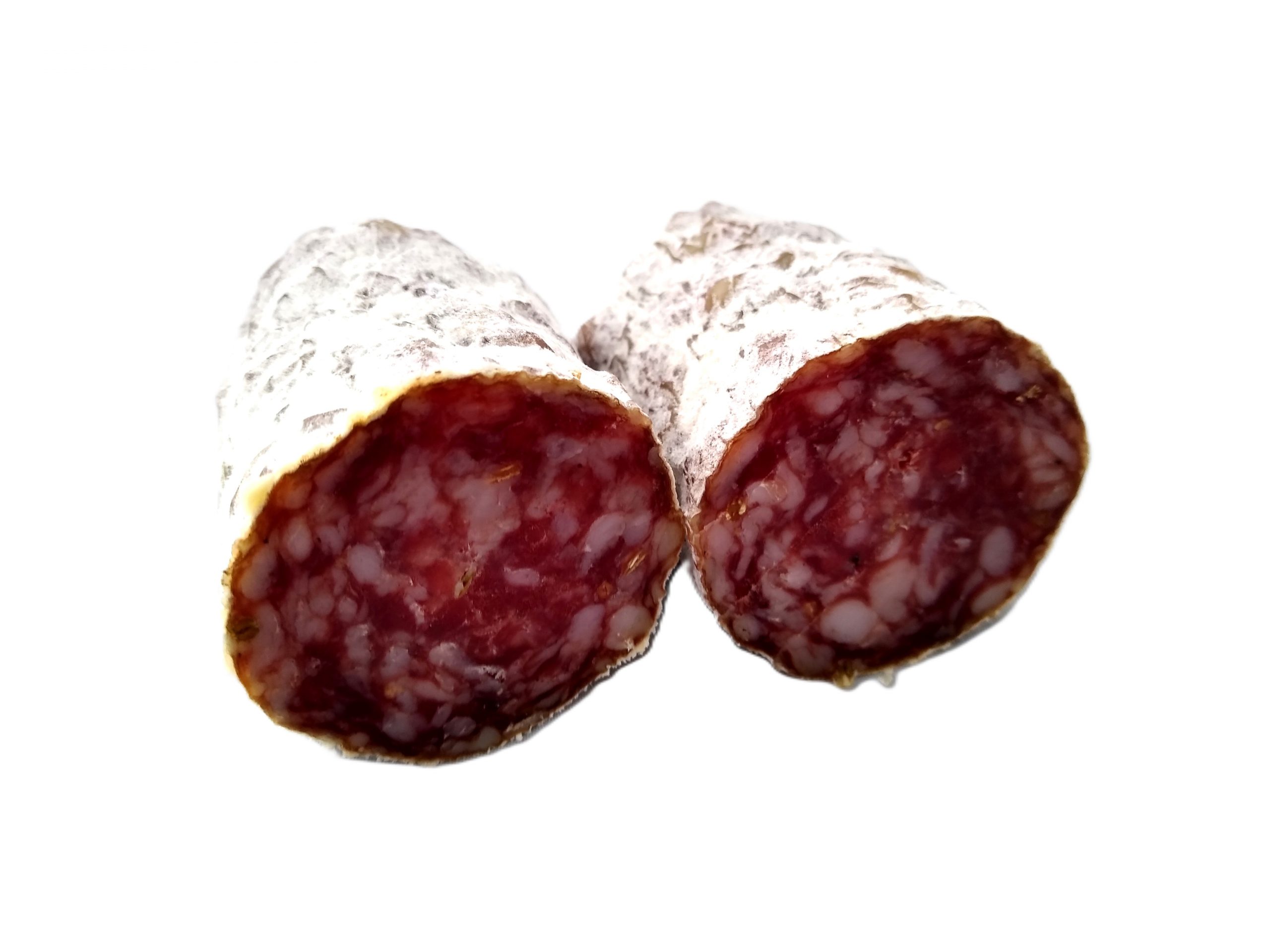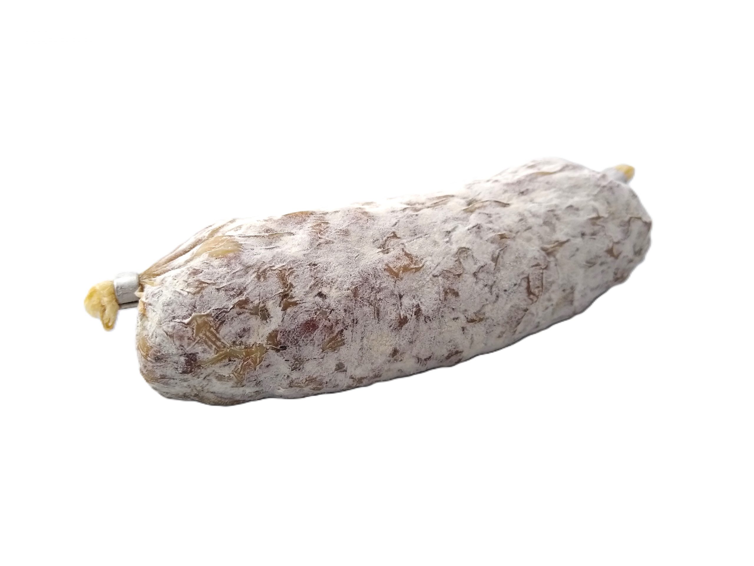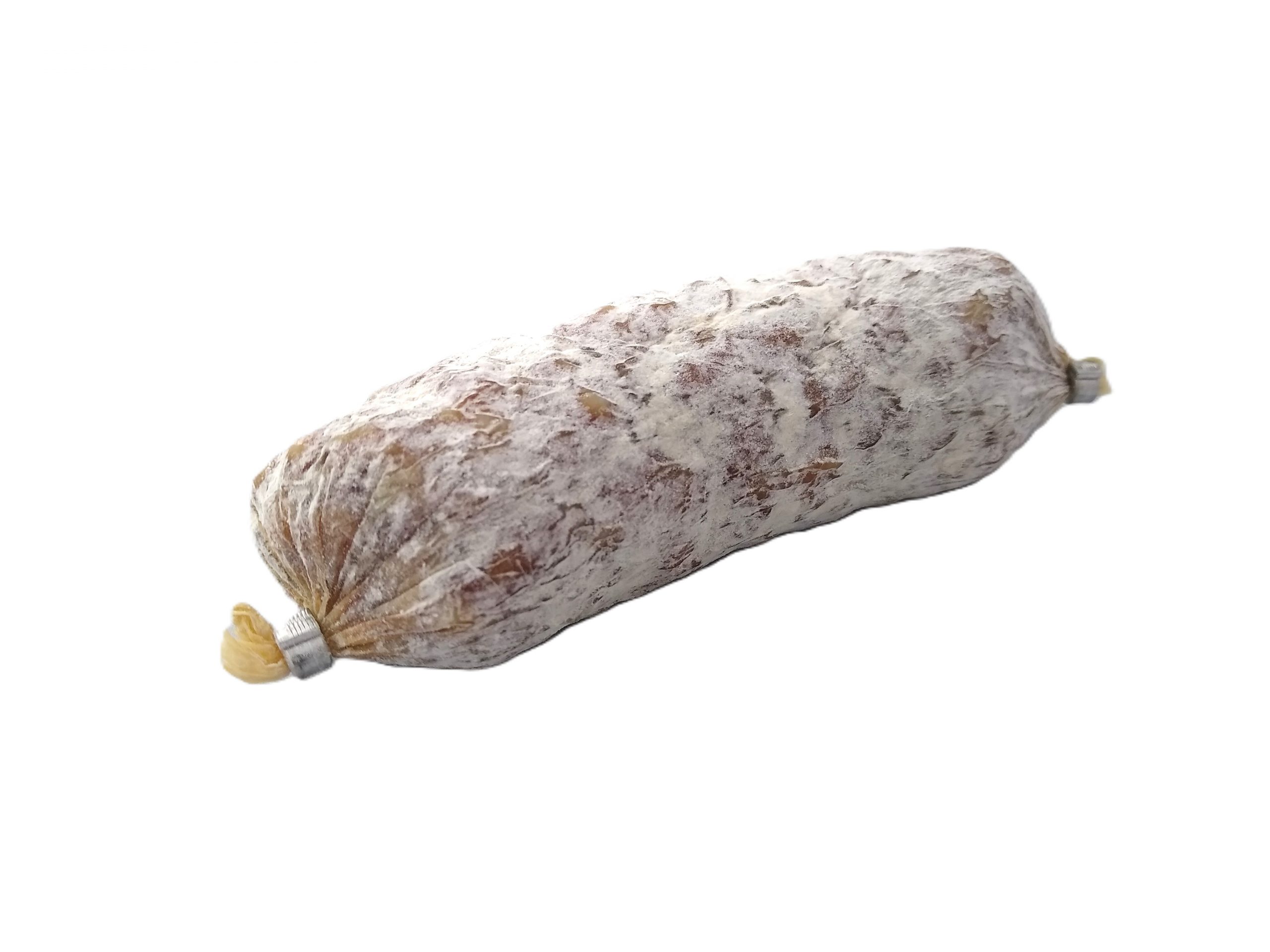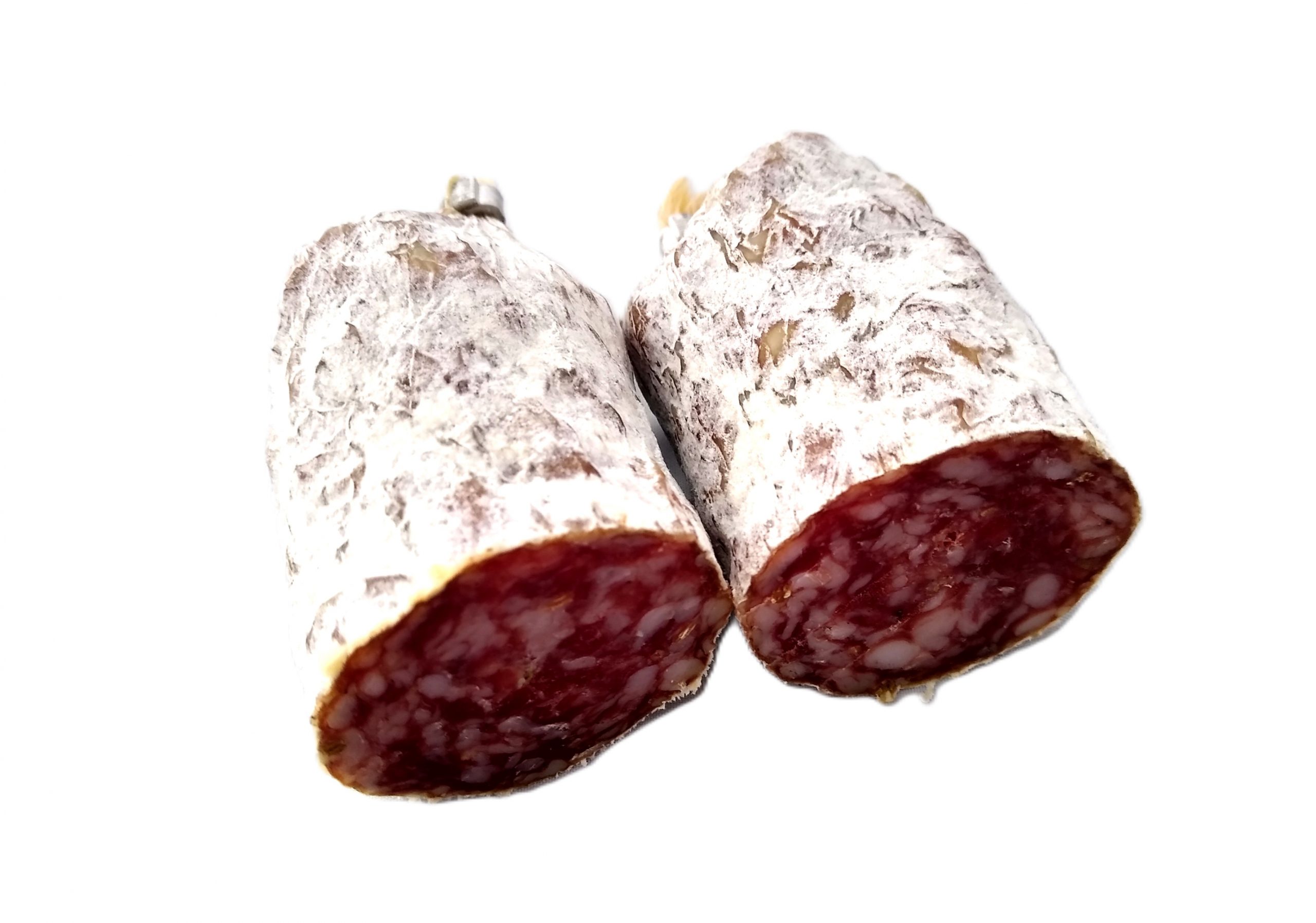 Die Salame Cacciatore ist eine traditionelle italienische Edelsalami, die nach alten Rezepturen hergestellt wird. Typisch für diese Spezialität ist ihr rustikaler Charakter: luftgetrocknet, mit einem weißen Edelschimmelüberzug und einer festen, aromatischen Struktur.